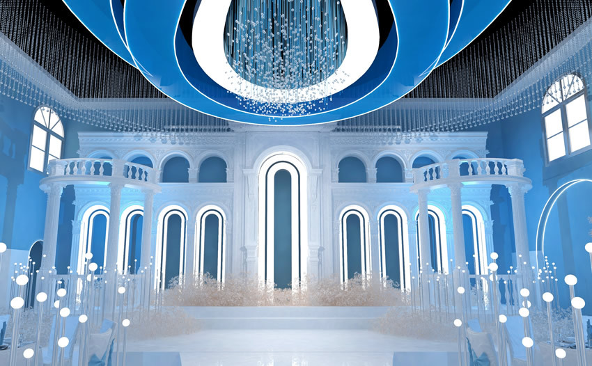 703ff253cde4b53ad56eceeeb00cb83a.jpg    色彩和主题:为婚礼堂设定一个主题和色彩方案,这样可以使整个空间更加统一和协调。例如,可以选择浪漫的粉色或蓝色,或者传统的红色或金色。